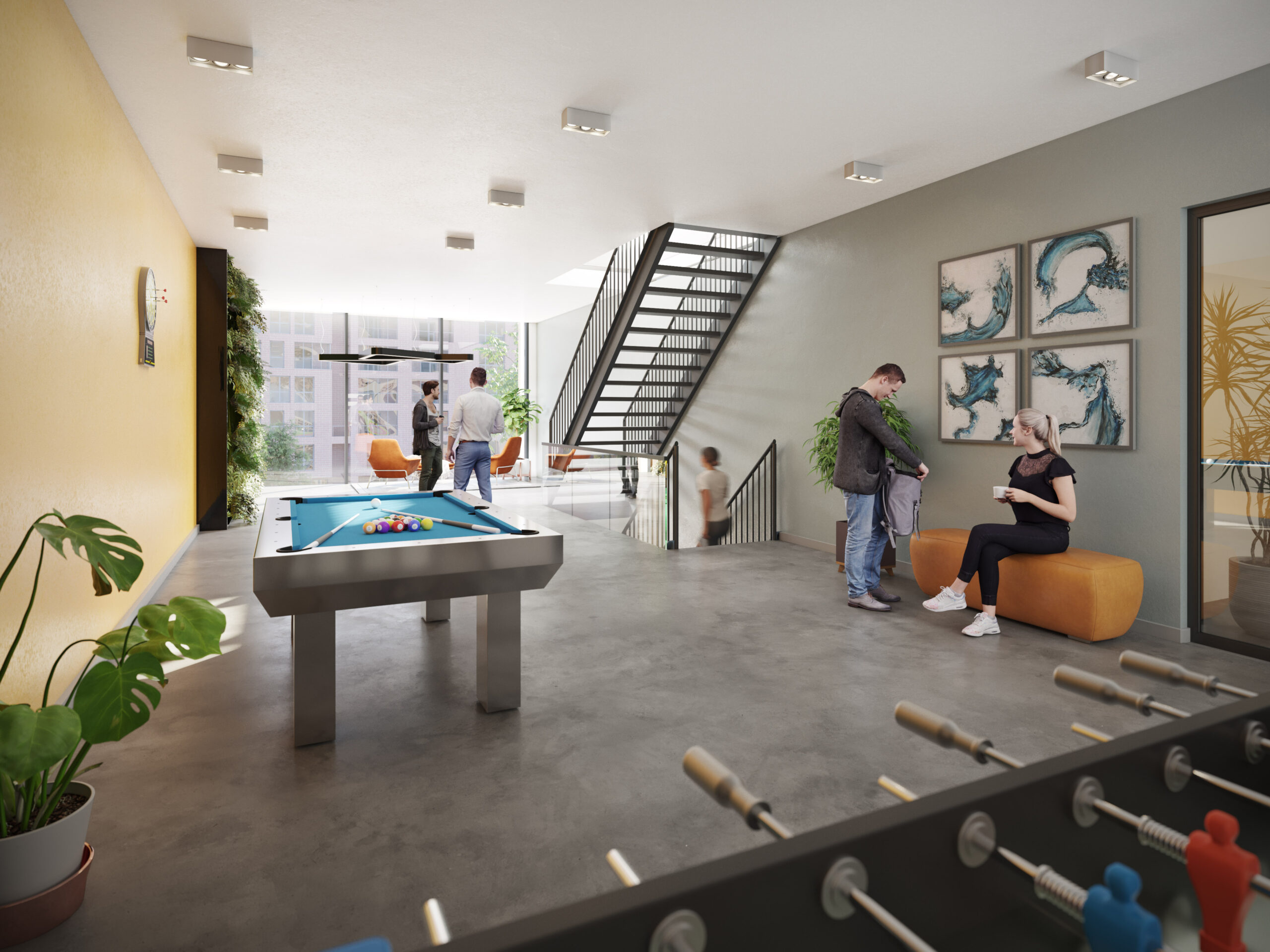 Superhandig: in het atrium vind je allerlei faciliteiten! Dat betekent dat je daar onder andere je kopje koffie kunt krijgen en bijvoorbeeld een potje fussball kunt spelen. En je vindt er natuurlijk even een ander behangetje. Dat geeft inspiratie voor de rest van de dag.